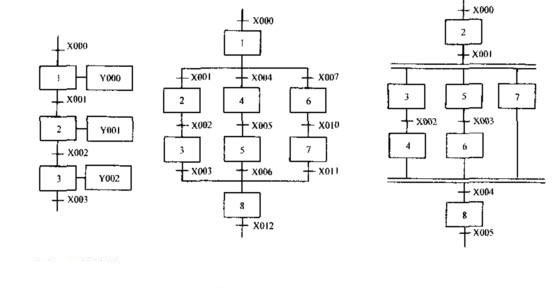 4. Jump and the cycle repeats sequence. In real systems often used step, repeating and cyclic sequences. This sequence of this practice is a choice special forms. As Figure 5-6 a, by shows for jumped step sequence, dang step 3 for activities step Shi, if conversion conditions X005 established, is jumped had step 4 and step 5 directly into step 6; figure 5-6B by shows for repeat sequence, dang step 6 for activities step Shi, if conversion conditions X004 not established and X005 established, again returns step 5, repeat implementation step 5 and step 6, until conversion conditions X004 established, into step 7; Figure 5-6C by shows for cycle sequence, in sequence end Hou, with repeat of way, directly returns initial step 0, Form a sequence of cycles.